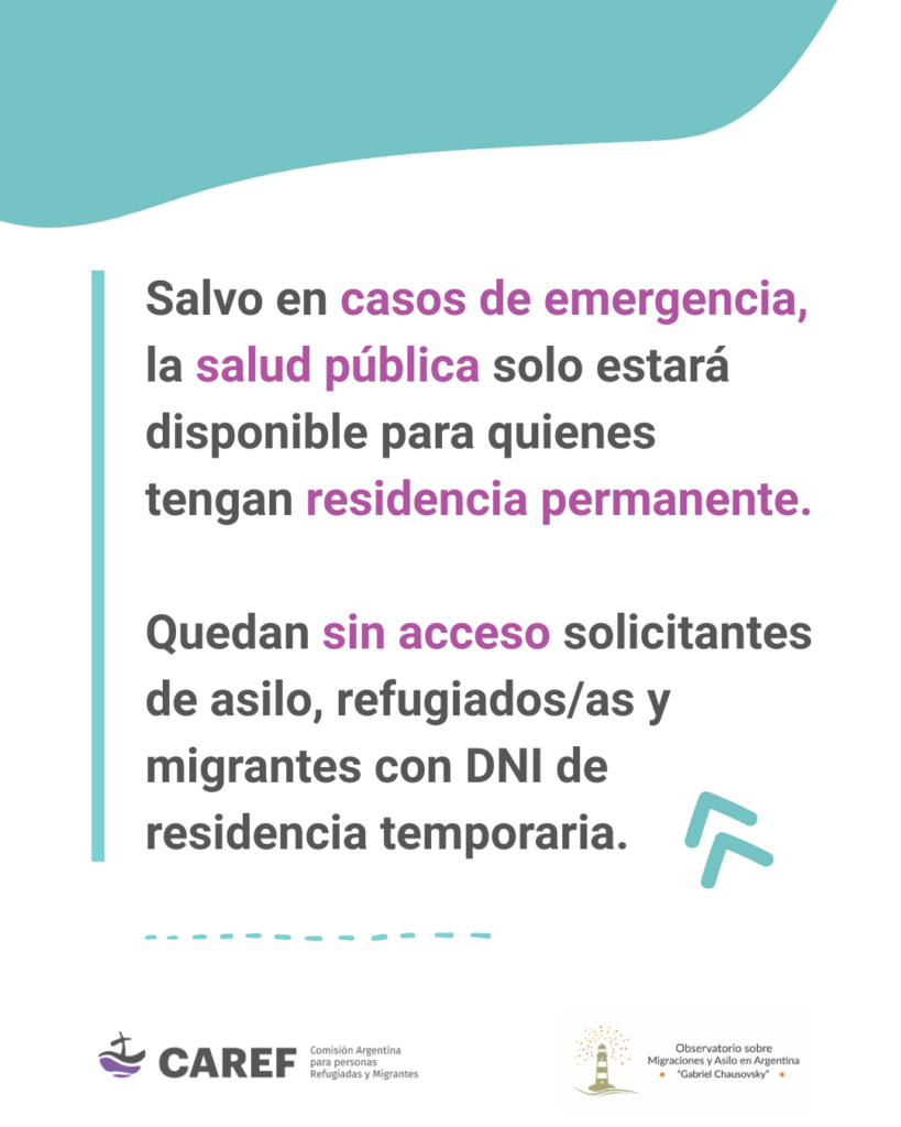 A partir del DNU 366/2025,la salud pública sólo está disponible para quienes cuenten con residencia permanente. Simultáneamente, el DNU restringe el acceso a la residencia permanente, que se obtiene demostrando solvencia económica mediante recibos de sueldo, pagos de monotributo o certificación contable de ingresos. (Históricamente, el 50% de los trabajadores/as migrantes son trabajadores no registrados, aunque sean residentes regulares con DNI).